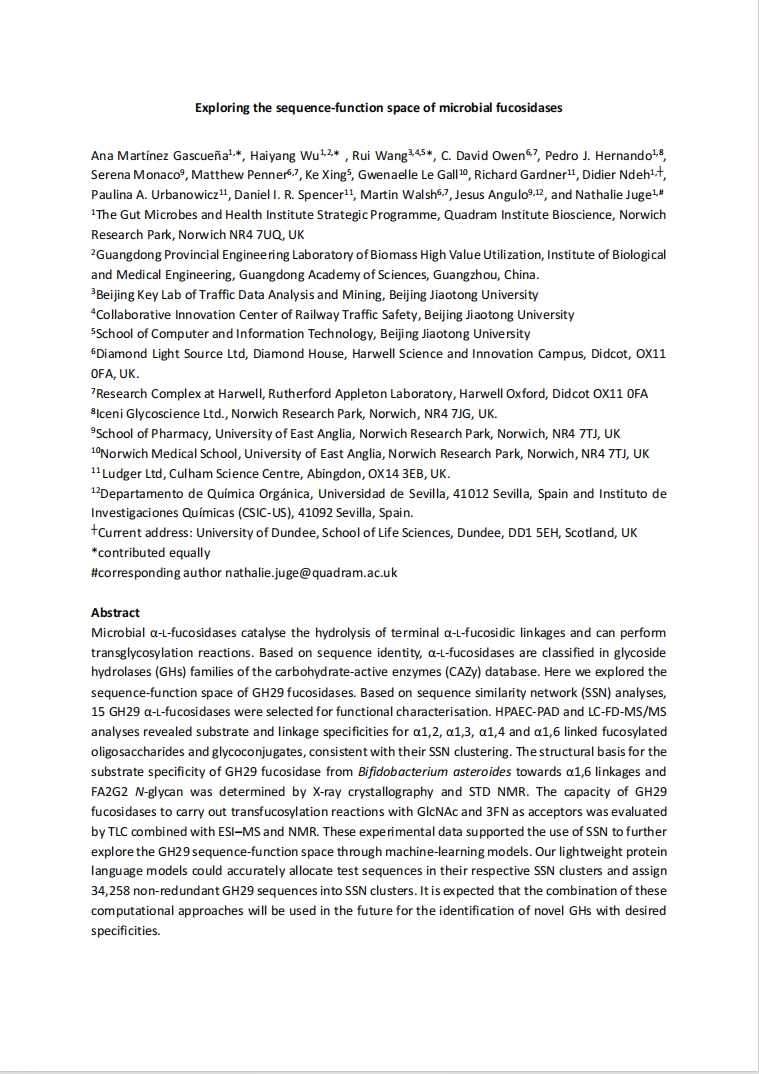 合作撰写论文《Exploring the sequence-function space of microbial fucosidases》, 并投稿Communication Chemistry - Nature期刊。