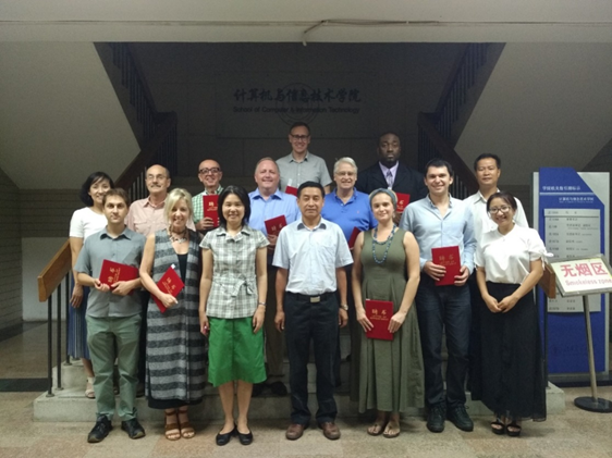 (金年会jinnianhuicom计算机信息与技术学院蔡伯根院长、杨晓晖书记、董敬祝副书记与暑校授课教授合影)