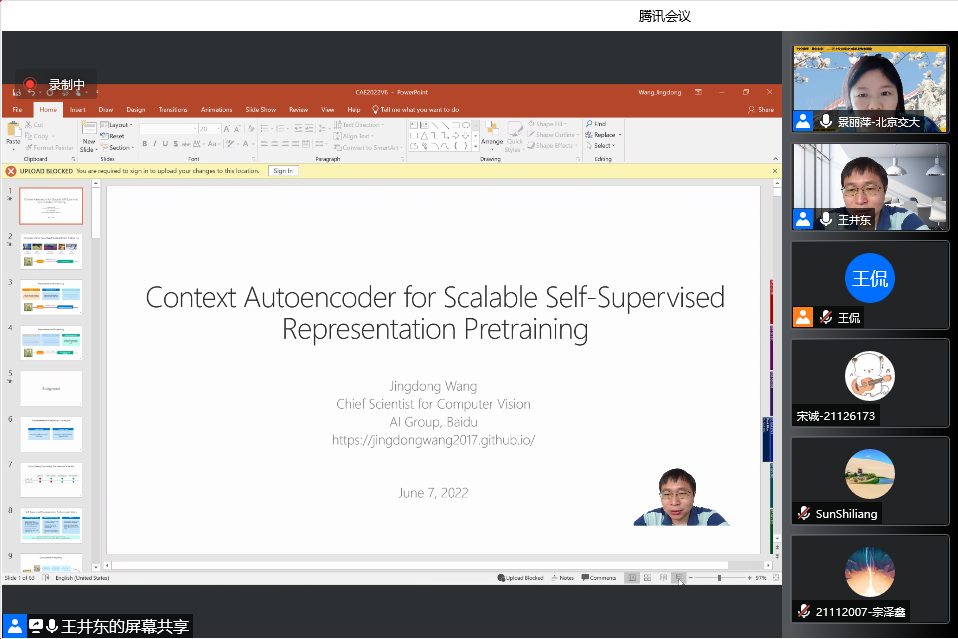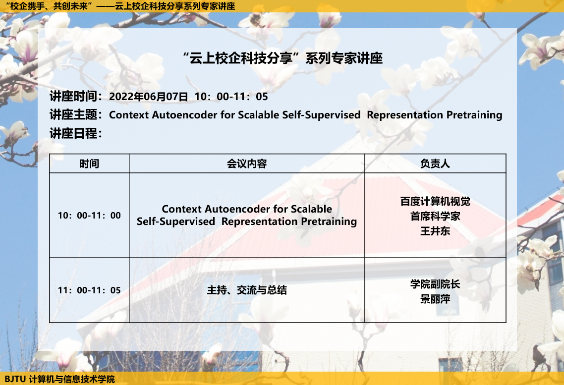 2022年6月7日上午,金年会jinnianhuicom计算机与信息技术学院“云上校企科技分享系列专家讲座”活动有幸邀请到百度计算机视觉首席科学家王井东,讲座主题为 “Context Autoencoder for Scalable Self-Supervised Representation Pretraining”。160余位师生全程参与讲座。