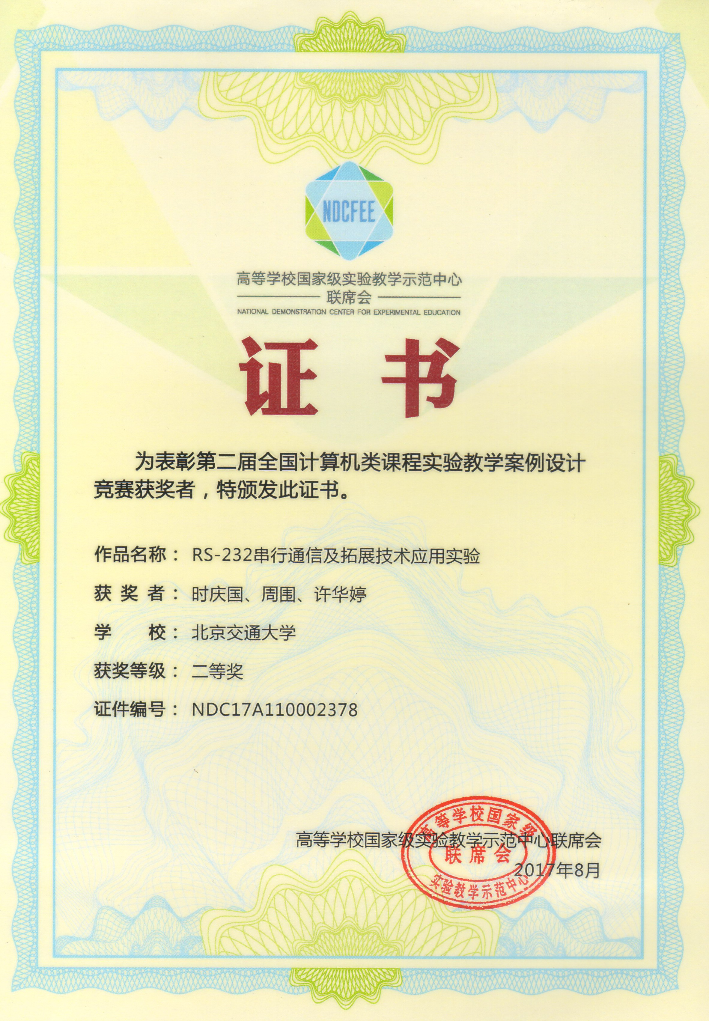 2017年11月11-12日,第十届全国高校计算机实践教学论坛暨第一届中国计算机实践教育学术会议在南京召开,有来自200余所高校的300余位教师参加。在本次学术会议上,金年会计算机基础教学基地时庆国、周围、许华婷老师开发的实验教学案例《RS-232串行通信及拓展技术应用实验》被评为二等奖。