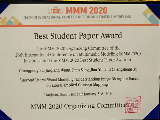 202015日至18日,在韩国大田召开了第26届国际多媒体建模大会(26th International Conference on Multimedia Modeling, MMM2020)。学院机器学习与认知计算团队完成的论文Beyond Literal Visual Modeling: Understanding Image Metaphor Based on Literal-Implied Concept Mapping通过专委会评审推荐、现场答辩、专委会评议,获得了本次会议唯一最佳学生论文奖(Best Student Paper Award)。