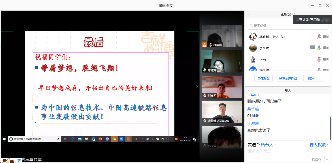 2020年6月29日下午四时,金年会铁路信息技术班毕业生座谈会于线上召开。参会人员包括刘峰、李红辉等8名网管研究中心教师和2016级计算机科学与技术(铁路信息技术)专业全体毕业班同学。