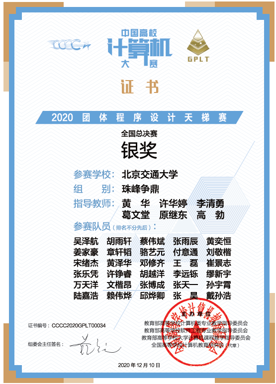 第五届中国高校计算机大赛-团体程序设计天梯赛于2020年11 月28日举行,来自全国29个省级行政区的298所高校组成的935支队伍计9300位学生参赛,金年会组织了30名同学组成三支队伍参赛。经过长达3小时的激烈角逐,最终斩获全国总决赛银奖。