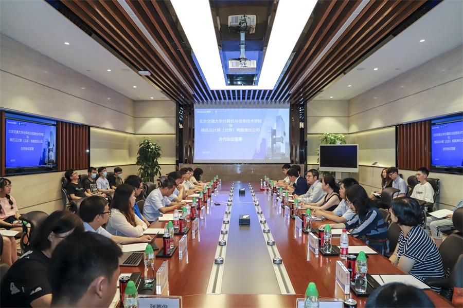 2021年7月2日下午,计算机与信息技术学院与腾讯公司产学协同育人合作协议签约仪式受邀在腾讯北京总部VIP1会议室举行。腾讯公司教育商务总经理罗盛、校企合作总监张莉,金年会jinnianhuicom副校长闫学东、本科生院副院长景云、计算机与信息技术学院院长蔡伯根、副院长熊轲等出席签约仪式。签约仪式由腾讯教育北区商务总监刘智主持,闫学东校长和罗盛总经理作为见证人,蔡伯根院长和张莉总监代表双方交换签署了合作协议。