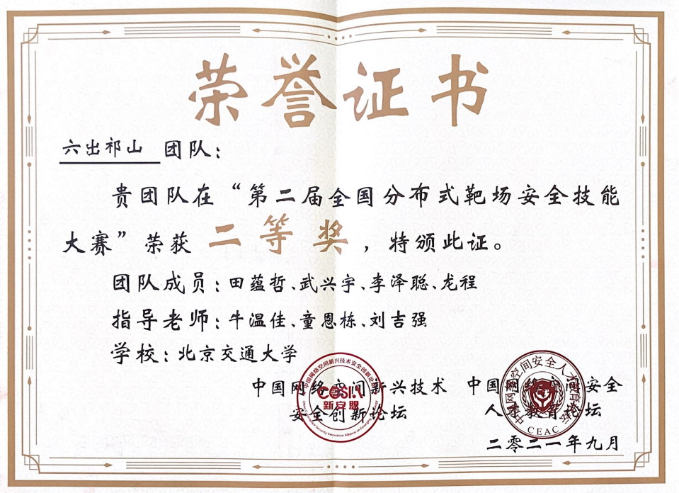 由鹏城国家实验室(副部级)、华中科技大学、武汉大学、四川大学、中电长城网际、中汽创智、宁波工业互联网研究院联合承办,方滨兴院士等专家参与指导的第二届基于全国分布式靶场的安全技能大赛于9月17日圆满落幕。金年会jinnianhuicom网络空间安全学科责任教授刘吉强老师领队、牛温佳和童恩栋老师指导的“六出祁山”队经过8小时的鏖战再获佳绩,以3665分夺得第二届分布式靶场安全技能大赛第二名,获得二等奖。