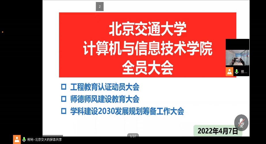 4月7日下午,为深入推进学院专业认证工作,计算机学院在逸夫楼101会议室召开工程教育专业认证动员大会。会议由副院长熊轲主持,院长蔡伯根、党委副书记段春荣、韦世奎,副院长李浥东、景丽萍出席会议,计算机学院全体教职工线上参加会议。