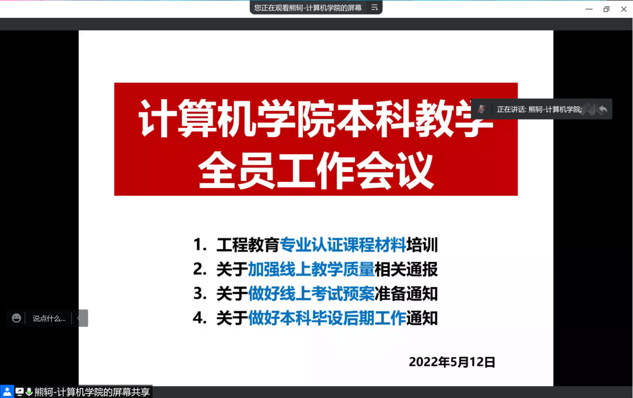 计算机学院对本科人才培养工作极为重视。5月12日上午,学院召开线上本科教学全员工作会议,所有院领导以及全院教师近150人参会。会议由副院长熊轲主持。