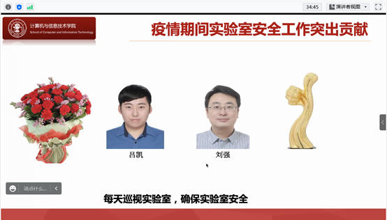 景丽萍副院长在会议上宣读了学院安全管理责任书内容,要求全体员工提高政治站位,强化安全红线意识,深刻认识实验室安全工作的重要性。并对近期检查发现的安全隐患问题进行了警示通报。最后对在疫情封校期间积极承担学院实验室安全巡视的吕凯、刘强两位老师表达了真诚谢意。