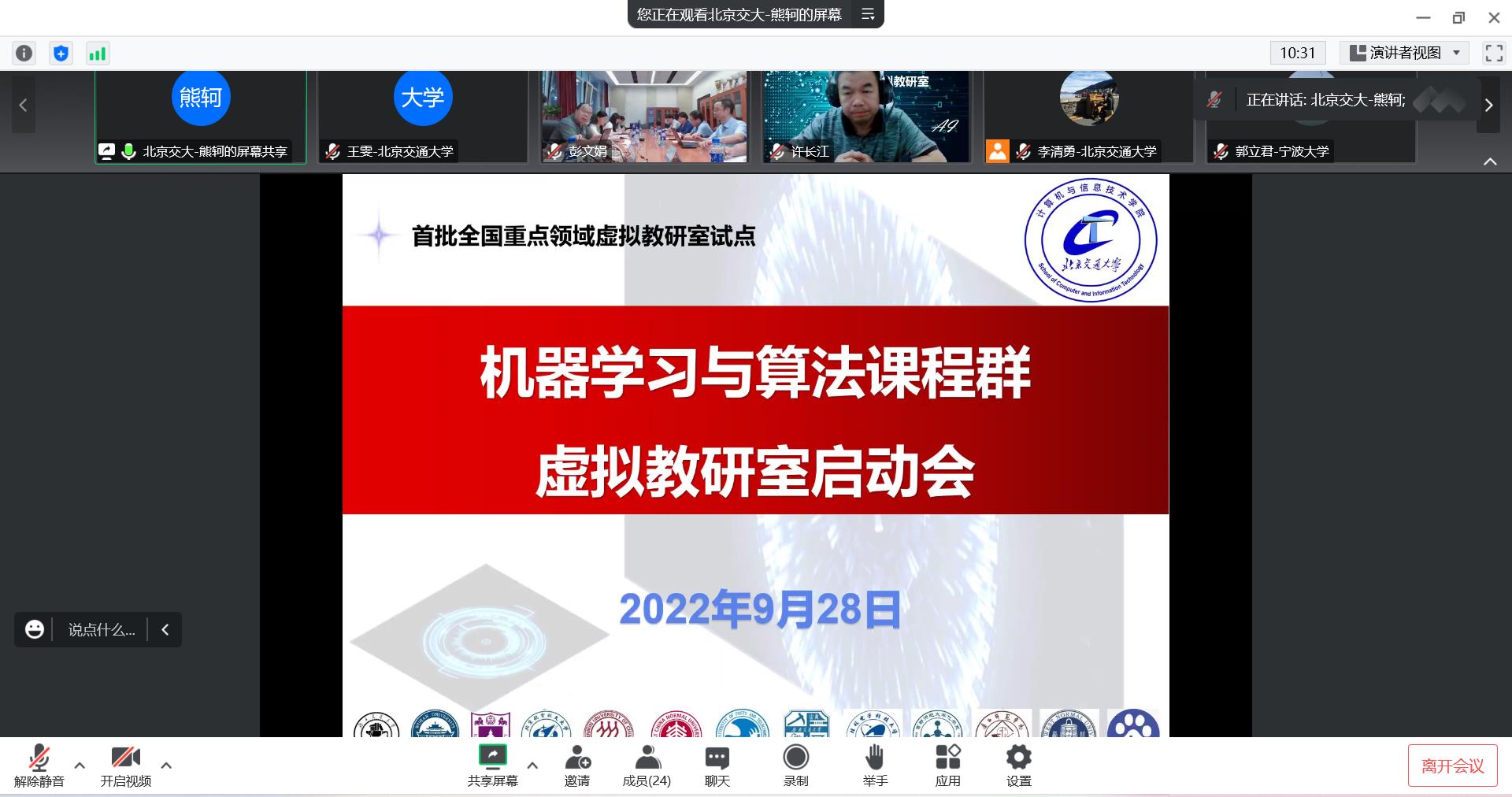 机器学习与算法课程群虚拟教研室于2022年9月28日下午通过线上线下结合的方式召开建设启动会。会议由金年会jinnianhuicom计算机与信息技术学院副院长熊轲教授主持,重点领域教学资源建设项目管理办公室副主任许长江、金年会jinnianhuicom本科生院副院长宋瑞、金年会jinnianhuicom计算机与信息技术学院院长蔡伯根参加会议并致辞,金年会jinnianhuicom、武汉大学、南京大学、北京航空航天大学、北京邮电大学、西南交通大学、中国矿业大学、华中师范大学、桂林电子科技大学、宁波大学、西北师范大学和武夷学院等虚拟教研室成员单位的专家和教师代表出席了会议。