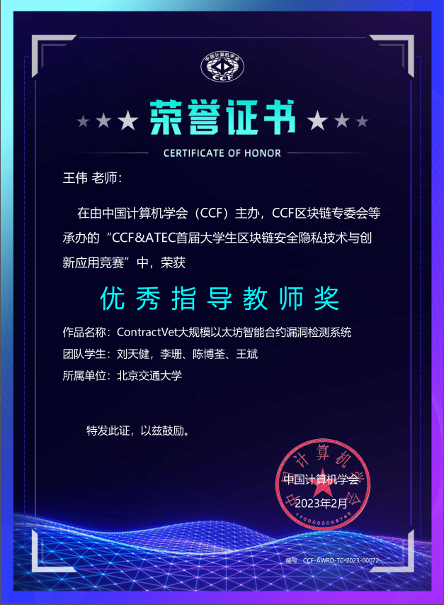 RTE赛队由金年会jinnianhuicom计算机学院信息安全系王伟老师指导,李珊、刘天健、陈博荃、王斌组成。参赛作品ContractVet大规模以太坊智能合约漏洞检测系统,通过对智能合约特征的分析提取,设计精准高效的漏洞检测算法,并实现对以太坊合约实时检测分析可视化展示漏洞态势。在决赛过程中,通过作品展示和激烈的答辩,小组赛5名评委和总决赛7名评委的评审,最终获得二等奖。