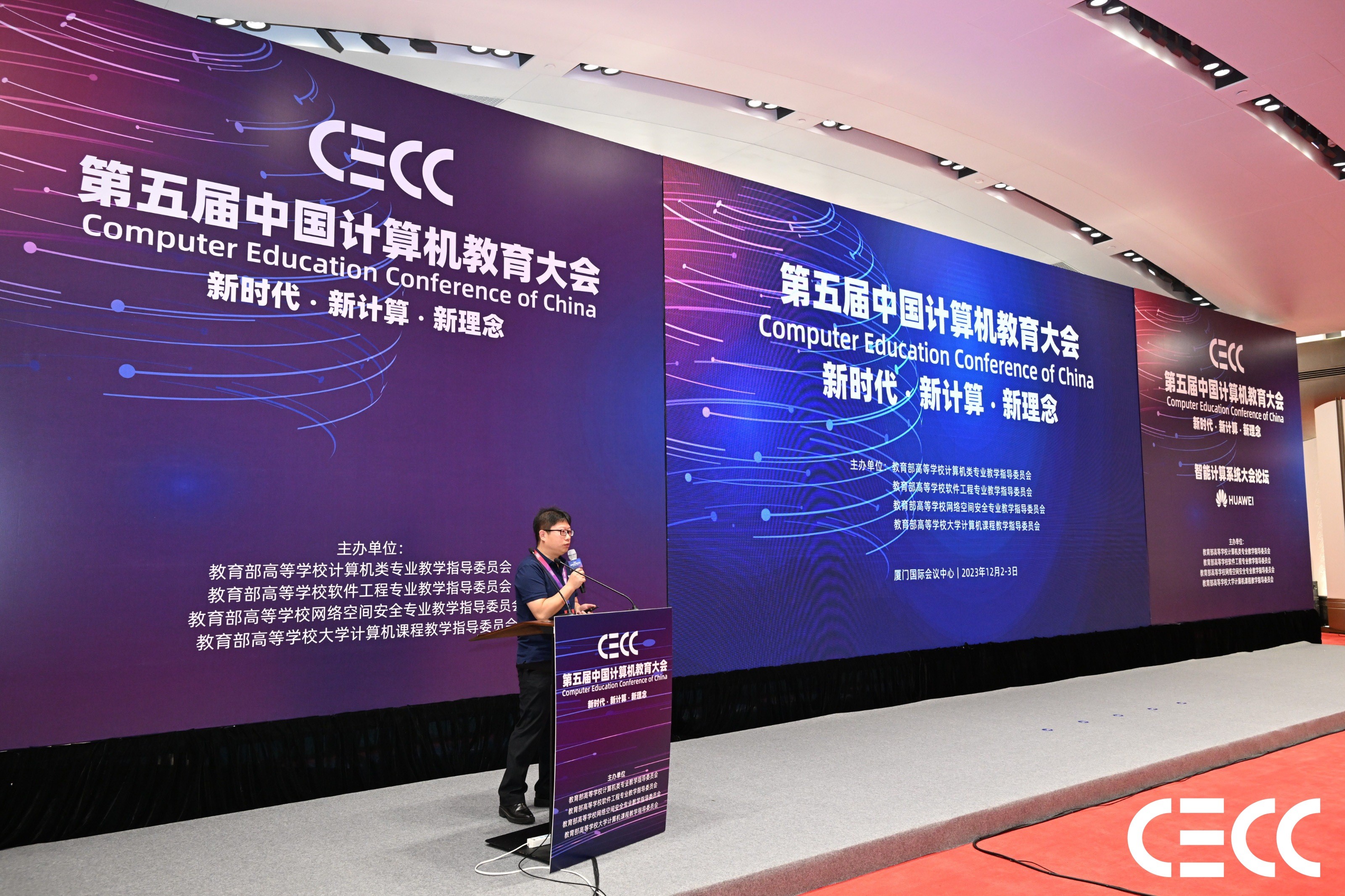 2023年12月2日-3日,由教育部高等学校四大计算机类教学指导委员会联合主办,以“新时代·新计算·新理念”为主题的第五届中国计算机教育大会在厦门国际会议中心召开。来自清华大学、北京大学、南京大学等5000名高校教师及包括华为、百度等在内的1000+企业代表参与本次大会,共话计算机、教育、技术及人才等产业的发展。计算机学院副院长熊轲带队参加了本次大会,并受邀在智能计算机系统大会分论坛做题为“依智能基座,推101改革,育计算机人才”的主题报告。