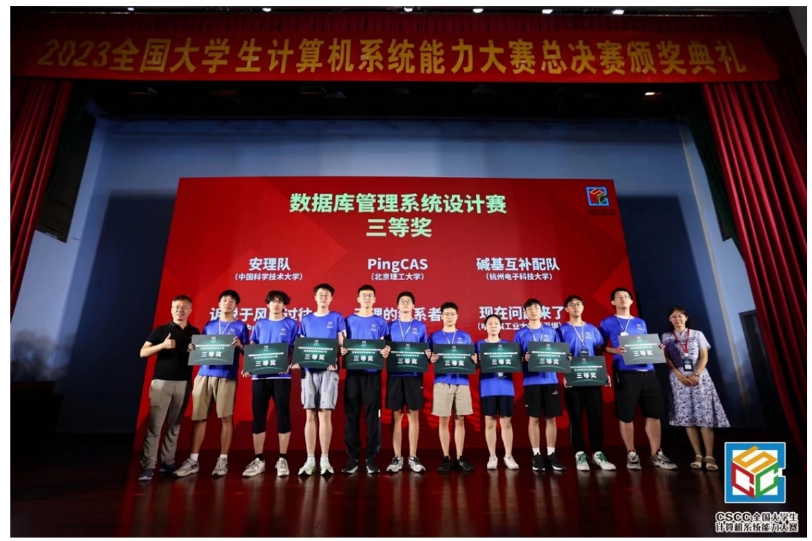 2023 年 8 月 23 日,经评审组评审和组委会复核,2023 全国大学生系统能力大赛决赛获奖名单正式公布。经过激烈角逐,金年会学生在数据库管理系统设计赛中获得三等奖1项,王宁老师获得优秀指导教师奖。