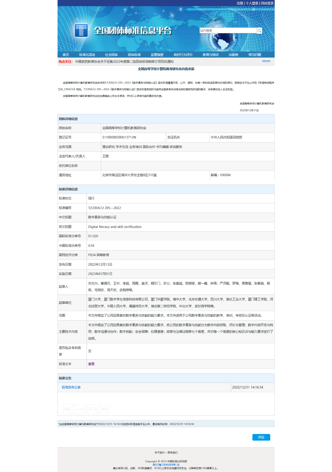 金年会周围老师加入研究会全国团队,作为起草人之一研发了“数字素养与技能”全国标准(T/CERACU 205—2022)(2023年1月1日实施);共同研发一级数字素养考试大纲、负责研发二级数字素养“R语言数据分析”考试大纲;鼓励学生参加DCLC试点活动,以考促学;参与建设DCLC题库,并在科普活动中面向社会公众宣传普及数据科学知识。