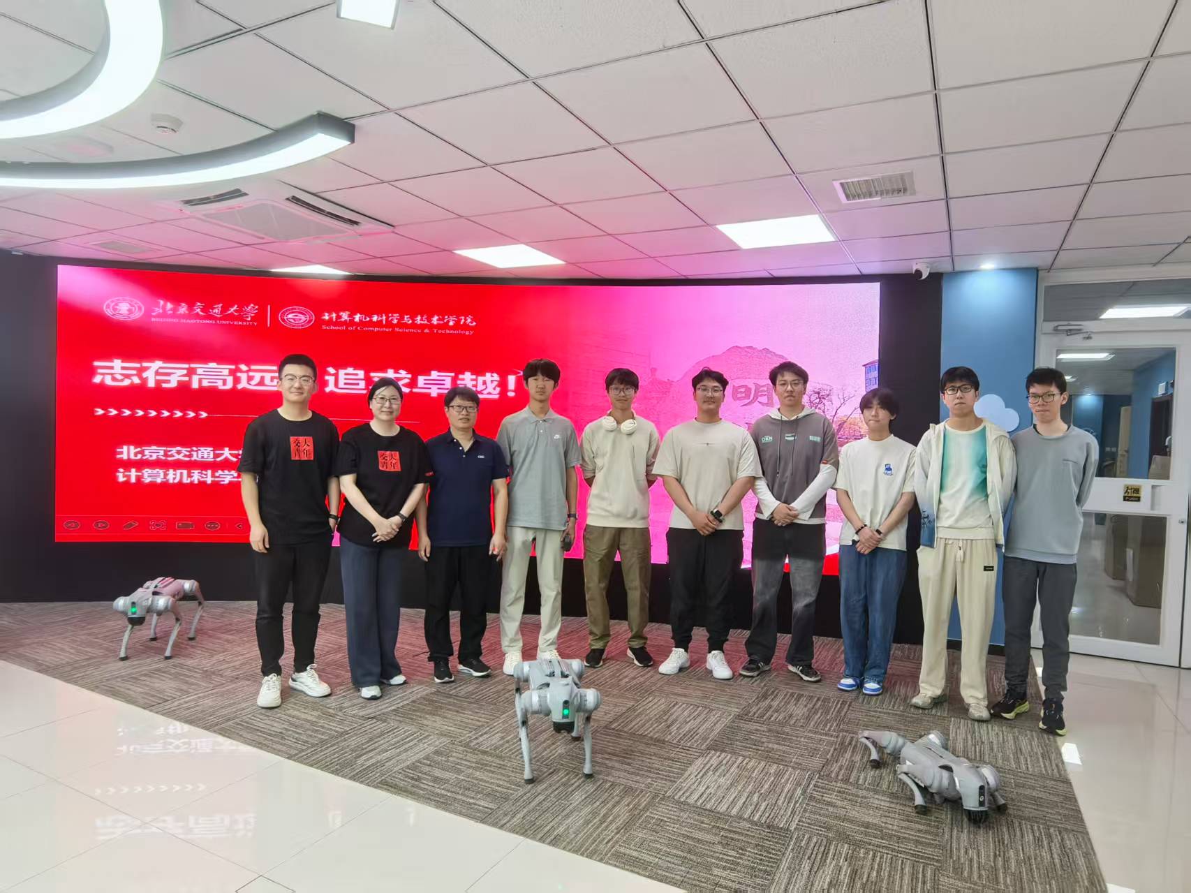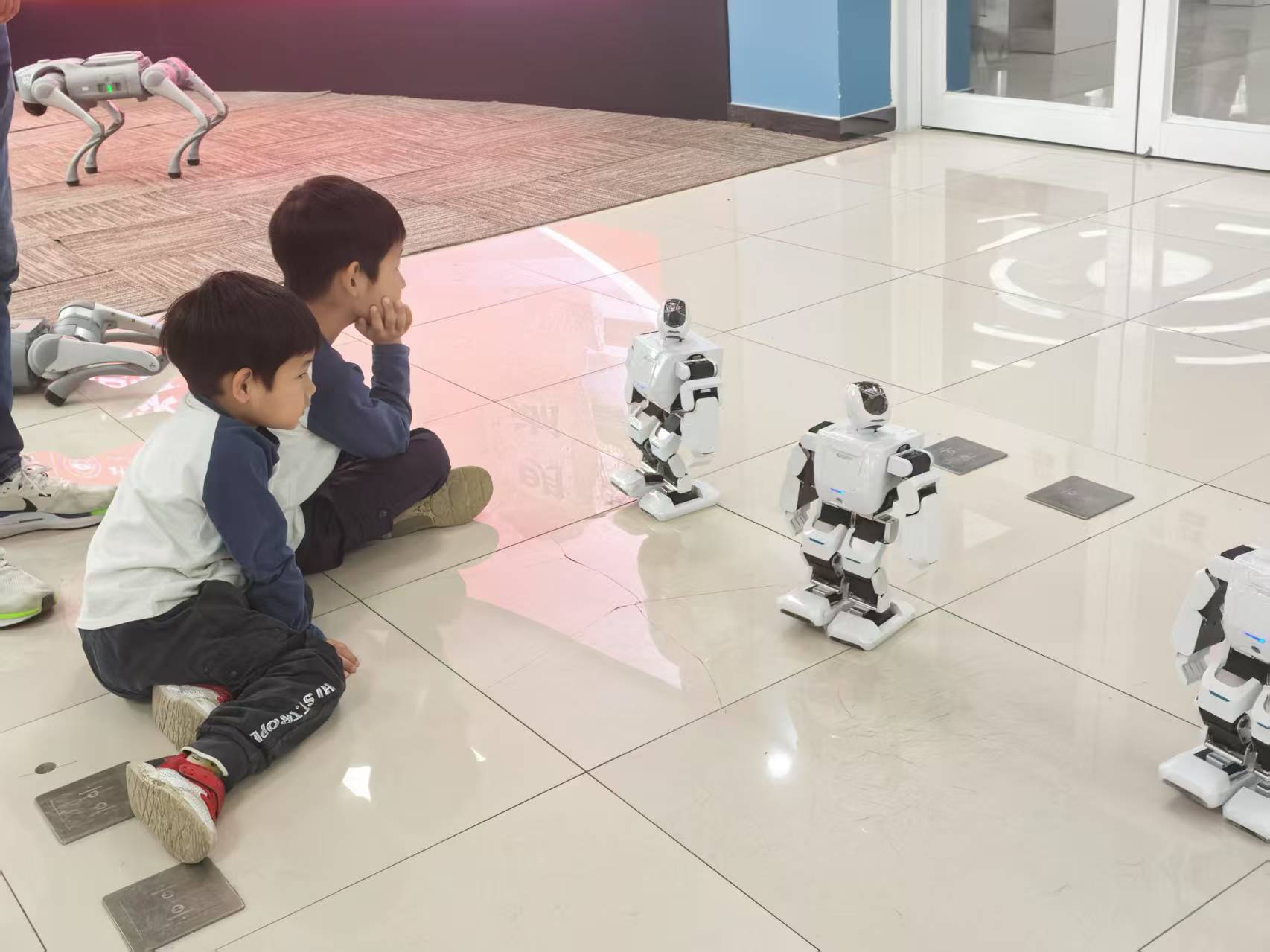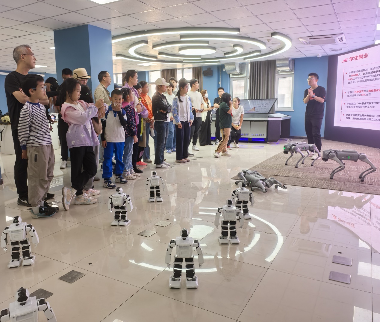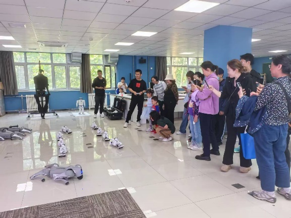 活动伊始,实验中心化身为充满未来感的科技乐园。在“机器人互动”展区,智能机器人通过语音识别、姿态感知等技术,与同学们展开趣味对话和协作游戏。机器人流畅的动作和机智的应答,让参与者直观感受到AI技术的思维逻辑与应用潜力。紧随其后的是“仿生机器狗表演”。四足机器人以灵活的身姿完成跳跃、避障、舞蹈等高难度动作,其仿生设计与精准控制技术引发阵阵惊叹。科普志愿者通过现场演示,揭秘了机器狗如何模拟生物运动原理,并结合传感器与算法实现自主决策。